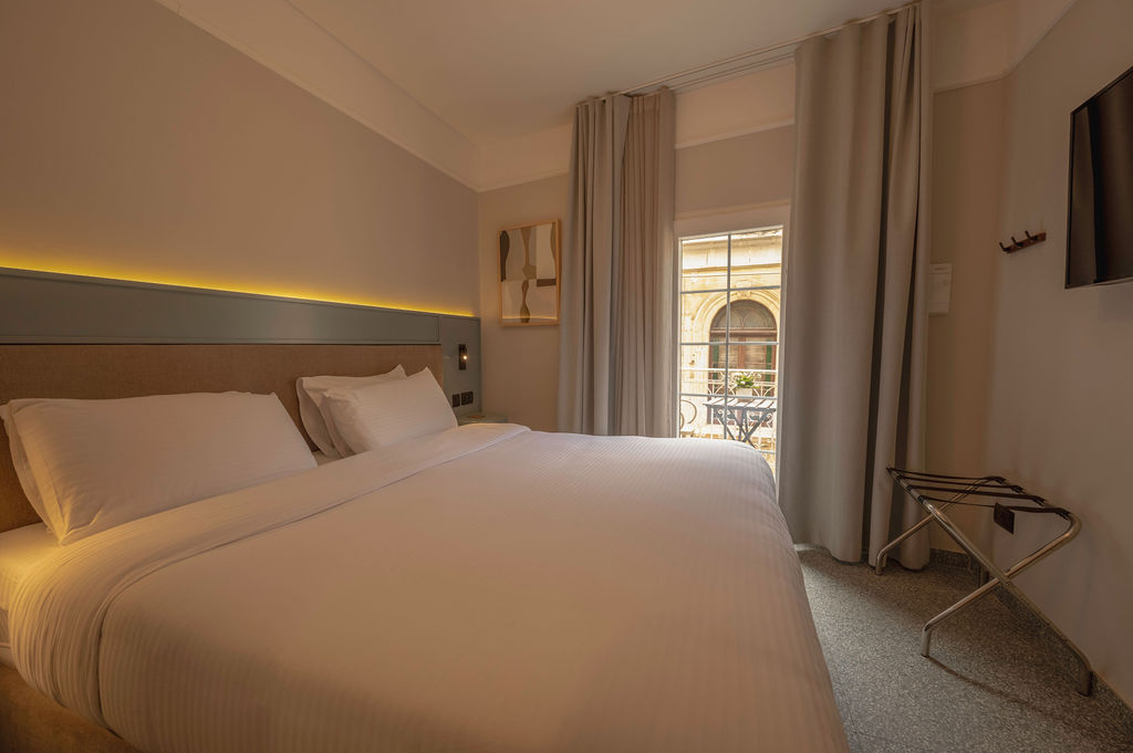 Enjoy our corner elegant private room with balcony overlooking street, designed in warm beige tones and tailored to the needs of private and business travelers alike. Room has a terrazzo tiled bathroom with a shower featuring rain shower head, available in king double or twin beds.